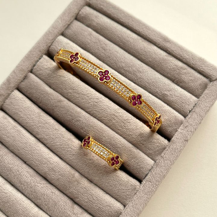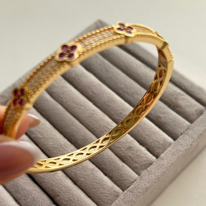 بنگل ونکلیف صورتی طرح طلا،از نظر کیفیت ساخت و آبکاری در سطح خیلی خوبی قرار دارد و ضد حساسیت است. برای ماندگاری این نوع آبکاری باید از الکل و مواد شوینده قوی دور باشد.