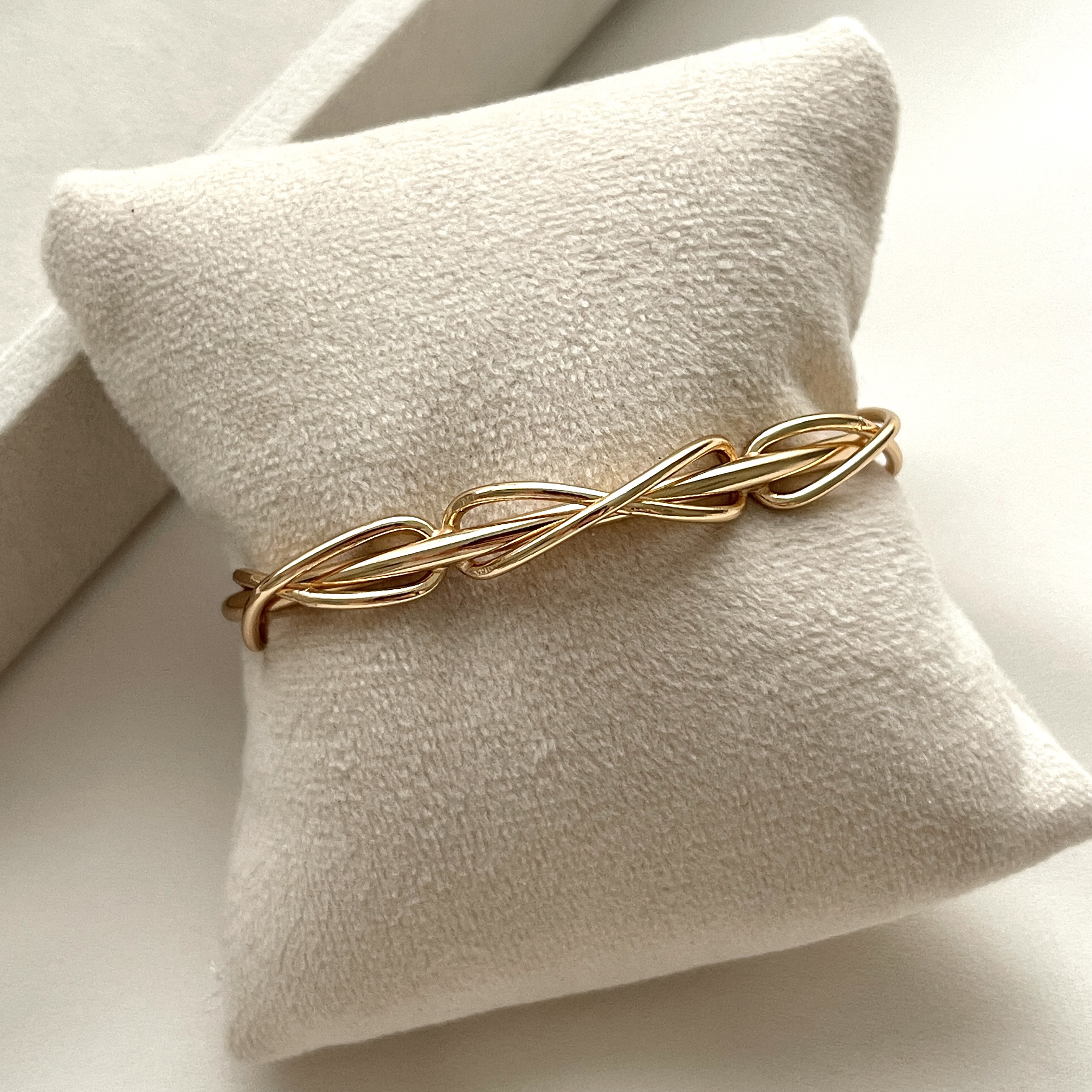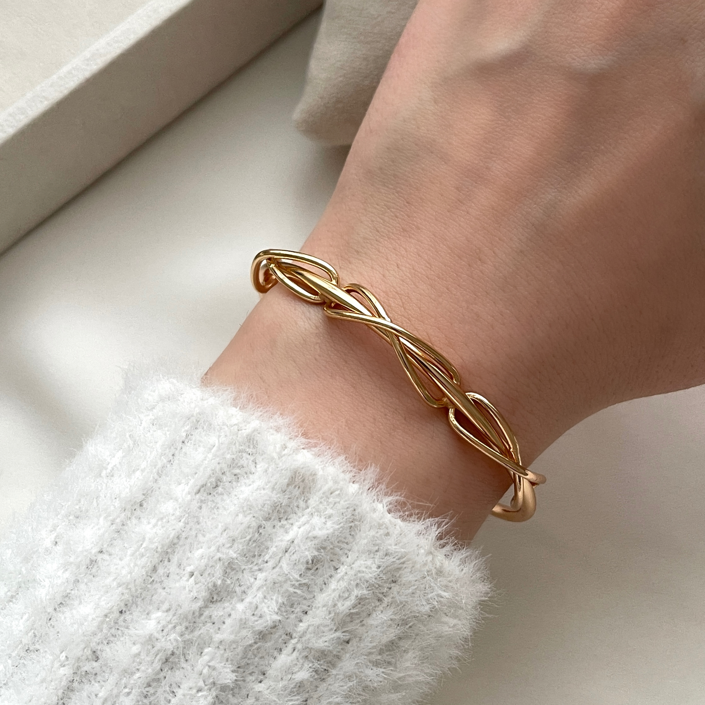 بنگل ژوپینگ طرح طلا، این محصول از ترکیب آلیاژهای مختلف شامل مس و … ساخته شده و با روکش طلای 18k کاور شده است.